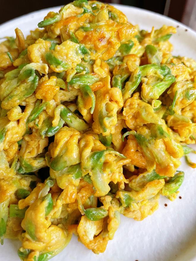 4、磕兩個(gè)雞蛋,加入鹽,蛋和花大概1:1比例,攪散,熱鍋熱油下入蛋液筷子不停攪散,蛋液凝固成熟就盛出就好了