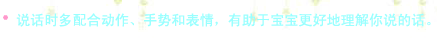 雖然大部分 1 歲左右的寶寶還不會說話,或者只能說很少的話,但是他們可以用手勢跟別人交流,你要多鼓勵他,當(dāng)然也要仔細觀察,及時替他表達,翻譯他的手勢。
